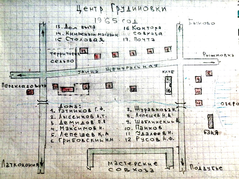 БАРАКИ. Следует отметить, что в 1950 - 1960 годы жизненный уровень жизни сельского населения вырос, был заметен строительный бум - всем желающим выделялись участки под строительство, оказывалась помощь стройматериалами. Для временного проживания существовало десять бараков. «В нашем бараке (возле старой школы) было два входа, первый вначале барака, соответственно, там было определённое количество квартир и наш, второй вход в конце барака. У нас жило пять семей, по моему, наша квартира (стенка), граничила с Коробовыми, у которых вход в барак был первый. За бараком располагались сараи для всех семей. Держали коров, свиней, кур», - воспоминает Елена Жлоба (Дудкина), - «Когда построили новую контору совхоза в 1970 году, старую отдали под жилье». «В интернатовском доме я жила до за мужества до 1970 года, а потом мы жили с мужем на квартире у Земцовой бабы Луши. Это 2-ой дом от начала Грудиновки со стороны Годылева с левой стороны, а потом заселяли бывшую контору и нам дали там комнату (1972 год). Здесь кроме Людмилы Григорьевны и Федора Ивановича Аниськовых жили Зеленевская баба Луша и Прудникова (девичья фамилия Панкова, директор СДК, родительский дом напротив) Людмила Ивановна с семьёй и другие, потом в бывшем доме Ступаковых, рядом с Басовыми» (воспоминания Людмилы Аниськовой). Из воспоминания Жанны Карусевич (Деминской): «Моя семья проживала в Грудиновке с 1973 по 1990 год. Я не считала наш дом бараком, прожив в нем, может, лет 5. Переехали, когда я ещё ходила в детский сад. А в новый дом, хорошо помню, переехали когда я пошла в 5 класс. А наш дом (бывший ФАП), который около парка, по дороге в школу всегда называли домом садовника. Может, это легенда. Помню, что потолки там были высокие. И жили там 3 семьи: мы, Пономаревы и Шаройко. С Леной и Сергеем мы в детстве через стену перестукивались. Между нами, кажется, даже дверь была заколоченная. С нашей стороны - большой коридор к ванной, а у них - зал был». Это воспоминания дочери, папа которой Деминский Виктор Захарович, работал главным ветеринарным врачом совхоза «Грудиновский», а мать Деминская Надежда Павловна, работала учителем химии в Грудиновской средней школе, а затем учителем химии и биологии и завучем в Грудиновской школе-интернате. От себя здесь дополню, что бригадиром в совхозе « Грудиновский» работал Пономорев Николай, а его жена (моя сестра) работала учителем в местной средней школы. Это они прежде жили в бараке около спиртзавода (где жил Журавлев). Сейчас двое детей, работа рядом, детсад напротив. Третью комнату занимала воспитательница в детском саду Шаройко Татьяна, воспитывающая одна двоих дочек. «Стоял барак с шестью квартирами. Он в 1956 году был там единственный, между стеной мастерских и нашим бараком. Двухэтажные дома* стали строить уже потом. Названия улицы не было у нас. Сейчас барак снесли, но на этом месте остались два дуба. Дубы посадили наши соседи в честь бракосочетания. Не знаю, сколько лет было дубам тогда, при посадке, но на этом месте они растут 64 года» - вспоминает Валентина Кузьменко (Корловская). * От себя уточню, что выше речь идет об улице 2х этажных кирпичных домов (Веселый переулок). Я даже снимал первые два дома в 1967 году, фотография которых была опубликована в газете «Маяк Приднепровья». «Я, Азаркова Люда. Родили меня на целине, в двухлетнем возрасте привезли в Грудиновку. С тех пор я уезжала о