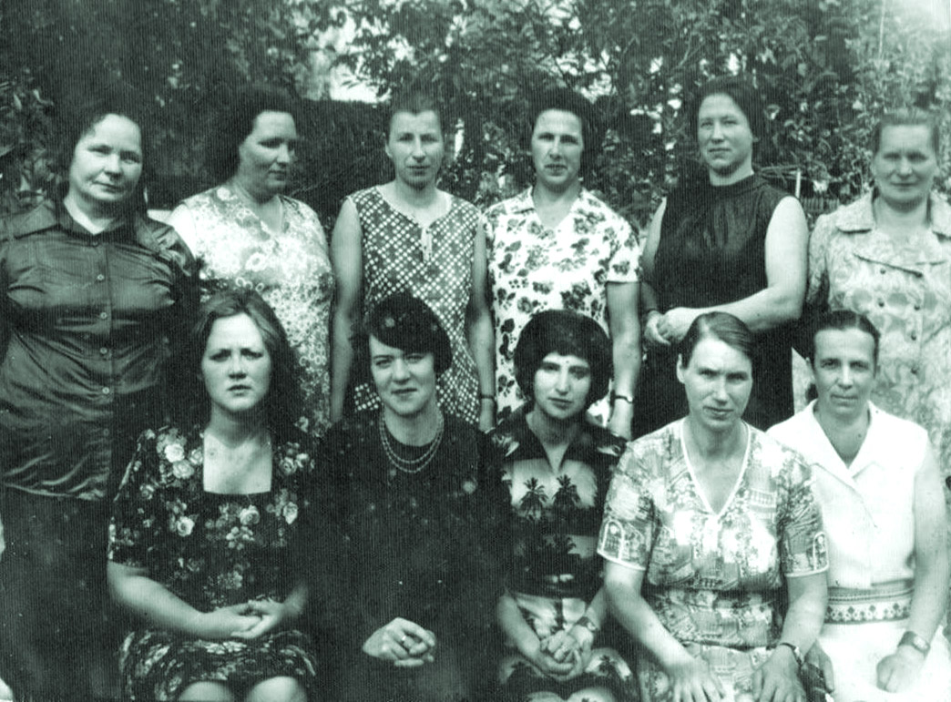 Коллектив детского сада. 1 ряд: Ступакова Валентина Степановна, Болматова Тамара Ивановна, Кускова Валентина Павловна, Барбатькова Зинаида Федосовна, Шаройко Татьяна Ивановна. 2 ряд: Ермолаева Мария Силаевна, Шитикова Полина Игнатьевна, Жиркова Раиса Васильевна, Царева Надежда Павловна, Голдаева Вера Михайловна, Денисенко Наталья Александровна.