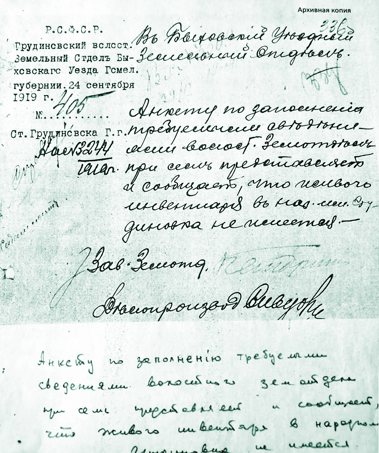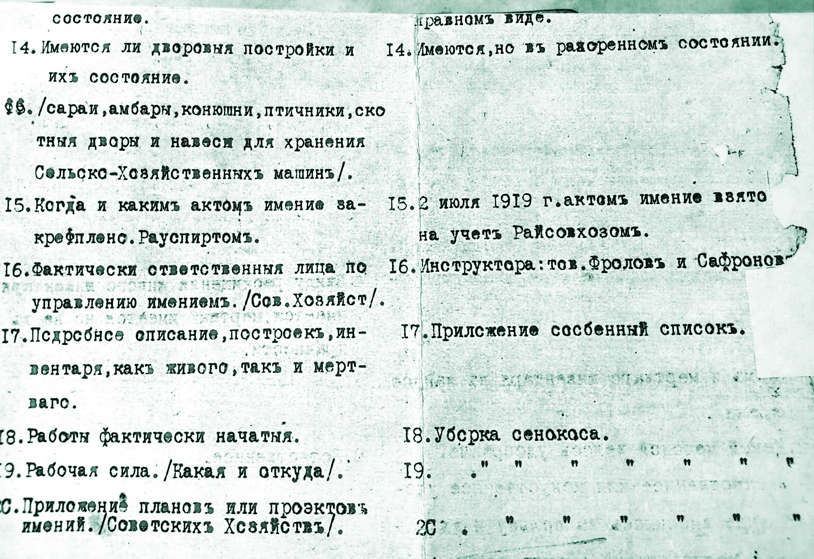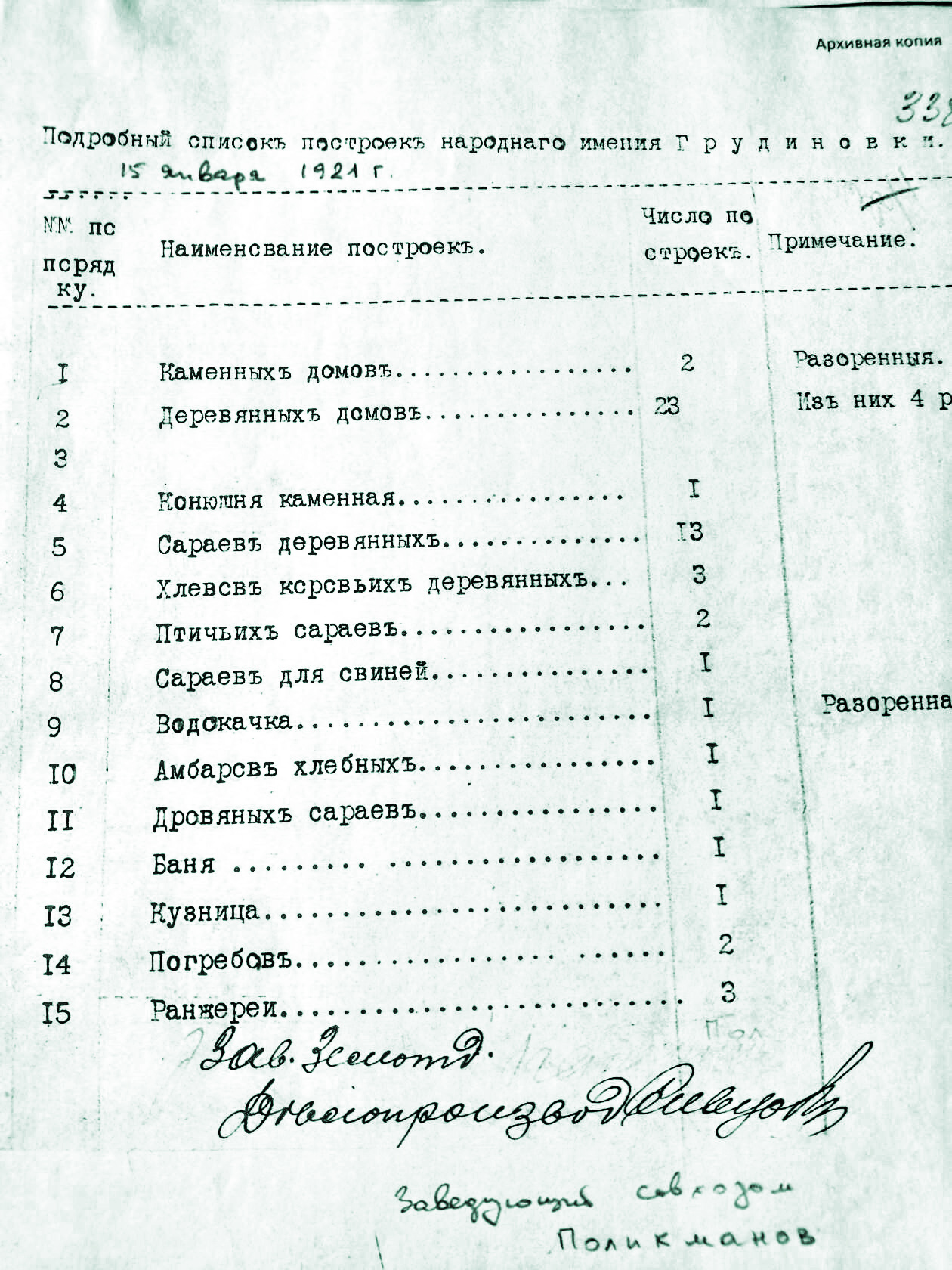 1. Первый вопрос. Название имения (советского хозяйства) и ответ - имение Грудиновка. 2. Местонахождение его: В быховском уезде Грудиновской волости, при Грудиновском винокуренном заводе, в 32 верстах от железодорожной станции города Быхова, станция Грудиновка Быховского уезда, Гомельской губернии Р.С.Ф.С.Р.. 3. Кому имение принадлежало ранее и кому принадлежит теперь: Ранее принадлежало графине Толстой. Теперь находится под ведением райсовхоза. 4. Площадь земли имения (советского хозяйства с разделением на удобную, не удобную, пахотную, лес, луга, сады, усадьбы, парки и прочее): удобная земля - 446 десятин, неудобная - 14, под лесом - 11308 (из них площадь заливных трав 339 десятин и суходольных - 101). всего 12292 десятин. Главная запись: 15. Когда и каким актом имение закреплено Рауспиртом: 2 июля 1919 года актом имение взято на учет райсовхозом и фактически ответственные лица по управлению имением (советского хозяйства) инструктора товарищи Фролов и Сафронов. Не менее интересен и п.17: 17. Подробное описание построек, инвентаря, как живого, так и мертвого: Приложение - особенный список.