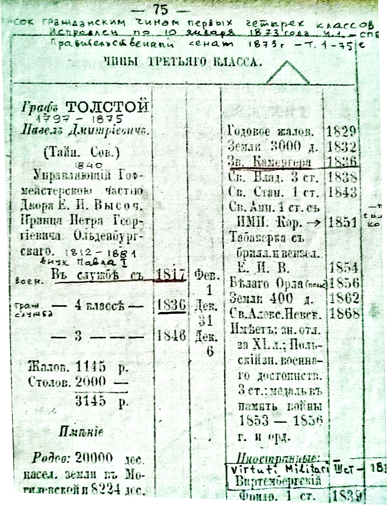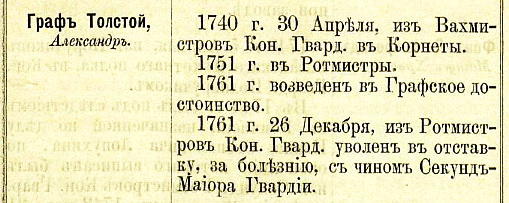 Так начинал военную службу и граф Дмитрий Толстой. Ни он сам, ни его родители не имели никакого недвижимого имущества, родового или благоприобретенного. Бедному безземельному графу оставалось уповать только на себя. Лишь успешная служебная карьера могла вывести его в люди. 1762 - ему 8 лет, а он уже вахмистр (нижний чин 14 класса) лейб-гвардии (т.е личная гвардия) конного полка. Затем был флигель-адъютантом у генерала - фельдмаршала графа Румянцева-Задунайского. 1784 - «пожалован в капитан-поручики по именному Ея Императорского величества Указу» и в 1789 «выпущен полковником».