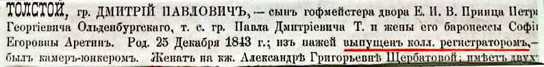 В разделе «фамильная усадьба в Грудиновке» (из летописи библиотеки-музея) помещено 5 фотографий из семьи Толстых. Одно из них Д.П.Толстой - молодой унтер-офицер. С учетом уже вышенаписанного считаю, что это снимок не графа Д.П.Толстого, т.к. он никогда не служил! Довольно долго граф Д.П.Толстой оставался холостым (ему 36 лет). Однако время мимолетных влюбленностей рано или поздно заканчивается. Вскоре он встретил настоящую любовь. Эта девушка была само обояние, с отличными познаниями и талантом ума. Избранницу звали княжна Александра, дочь князя Г.А.Щербатова (1819-1881), помещика московской, саратовской и екатеринославской губерний. Он имел 4000 крепостных крестьян. Вступив в 1848 году в управление наследственными имениями, отменил барщину и занялся организацией крестьянского самоуправления. В имениях, управляемых им, крестьяне пользовались всей землей без исключения за определенный оброк. Бургамистр назначался из их же среды и ни разу князь не пригласил управляющего из иностранцев (как было тогда в моде) или посторонних людей. Его жена - С.А.Панина (1825-1905) посвятила себя благотворительной деятельности. Это ее наследством от матери, имением Марьино (Василевское) в московской губернии Рузского уезда, с 1877г. будет владеть самый младший их сын - Александр Григорьевич Щербатов.