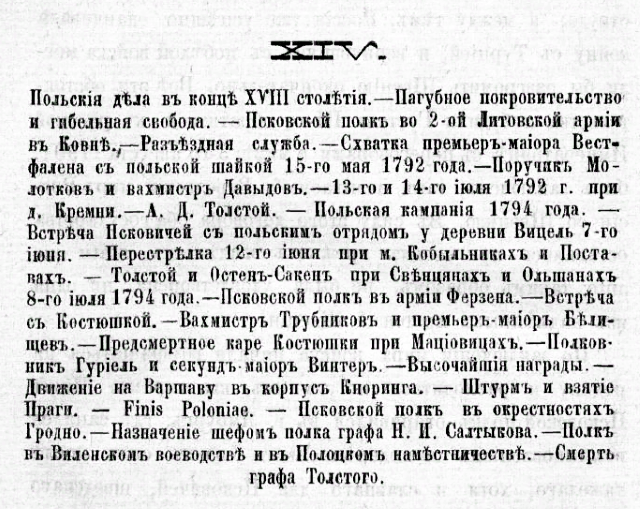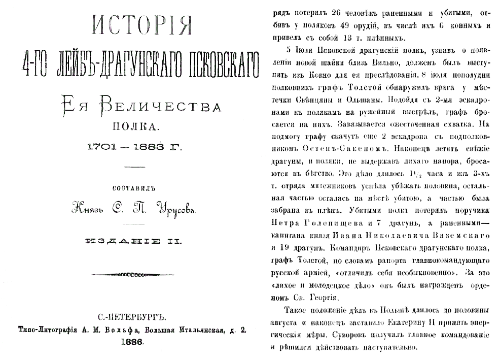 Русско-польская война 1792 года (началась 7 мая и закончилась 16 июля ). К концу столетия Польша непрерывно страдала внутренними раздорами и неурядицею. Главнейшим поводом к этим раздорам служило право польского сейма избирать короля, власть которого в 18 столетии перестала быть наследственной. Образовались партии. Обыкновенно претендентами на престол являлись 2-3 наиболее влиятельных магната и каждый старался склонить решения сейма в свою пользу. Впоследствии стали искать опоры и поддержки в соседних государствах. Эти последние получили, таким образом, полную возможность вмешиваться в дела Польши. 3 мая 1791 принята конституция, в которой было утверждено право Речи Посполитой самовольно проводить внутреннюю политику. Крупные польские магнаты сформировали Тарговицкую шляхетскую конфедерацию во главе с маршалом Станиславом Потоцким. Цель - отмена польской конституции. Обратились к Екатерине II. Ингерманландский карабинерный полк квартировал в Полоцком наместничестве. В апреле 1792 полк идет к месту сосредоточения колонны армии генерала Кречетникова - в Динабург. Эта армия наступает с четырех разных сторон театра войны (Полоцк, Динабург, Толочин и Рогачев) - две северные колонны к Вильно, а две южные к Гродно. Полк в составе второй колонны, бывшей под начальством генерал-поручика князя Долгорукова. 11 мая эта колонна перешла границу у Динабурга и через Видзы направилась к Вильно. В связи с первой колонной находилась и вторая, направляющаяся из Полоцка через Михалишки к Вильно. 31 мая полк в числе прочих вступили в Вильно без единого выстрела. 14 июня в присутствии генерала Кречетникова состоялось провозглашение Литовской генеральной конференции. Вслед за этим обе колонны выступили на Гродно. Без выстрела занимает 25 июня князь Долгорукий Гродно - вторую столицу Литвы. 23 января 1793 года произошел 2 ой раздел Речи Посполитой. (Свенцяны - Швенченис в настоящее время; Ковно (до 1795) - нынешний Каунас; Динабург (другие названия - Борисоглебов, Двинск, нынешний Даугавпилс; Вильно - прежнее название Вильнюса). 1793 - 1798 Д.А.Толстой - командир псковского драгунского полка, полковник.