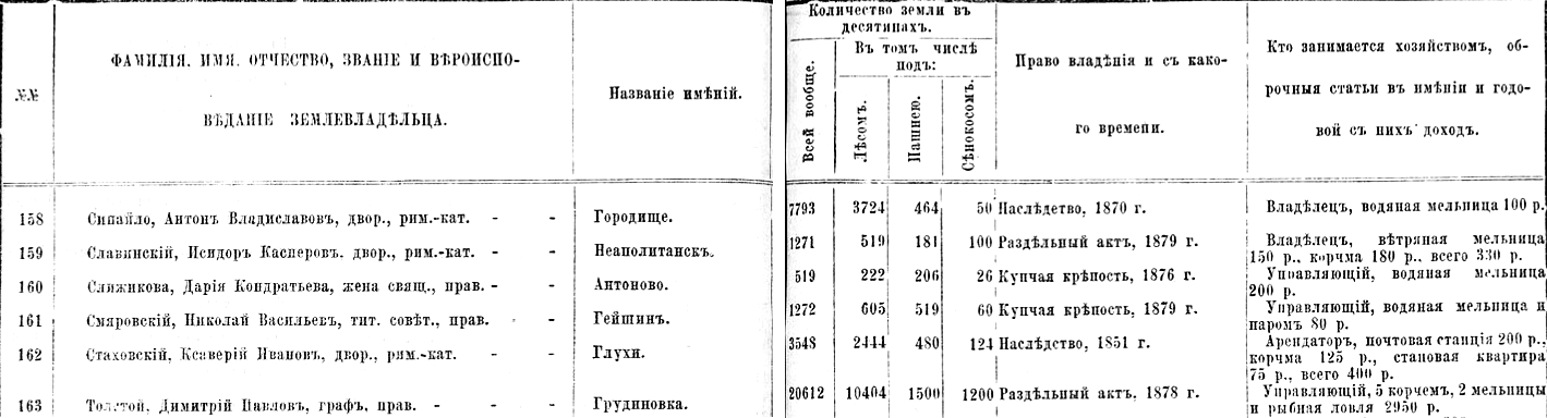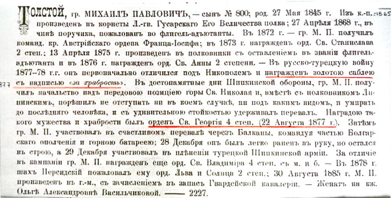 Истощение почвы одностороннею культурою зерновых хлебов заставляло помещика изыскивать средства и получению большого количества удобрения и цель эта достигалась устройством винокуренного завода. Винокурие не требовало значительных затрат. Главная задача хозяина состояло в получении отброса в виде бурды, количества скота. Не эти ли доводы подтолкнули графиню к постройке спиртзавода, вопреки существующему мнению в печати, что завод необходим был для переработки плодов сада (хотя сад существовал столетие). Как не князь поделился своим замыслом строительства нового здания в своем имении, как не он посоветовал сделать молодой чете то же самое? Скажу больше - в чертежах архитектора-самоучки Бойцова родился двухэтажный каменный дворец в стиле неоклассицизма. Двухэтажное здание дворца с полукруглой верандой, поддерживаемая шестью колоннами, выполненными в тосканском ордере. Здание увенчено давольно плоским куполом, а центральная часть - аттик, возвышающимся над раскрепованным карнизом. По бокам к основному двухэтажному обьему примыкают два одноэтажных крыла. Все три обьема объединены одинаковыми массивными сложными карнизами. Дом носил парадное предназначение, в нем не жили (жили в старинном деревянном барском доме на территории фольварка. Как и парк! Создавая его в своем имении князь покупал редкие деревья на два имения. Знакомясь с его парком, я обнаружил, что в Васильевском (его имении) растет только одна единственная листвинница. Для сравнения - в Грудиновке приблизительно треть всех деревьев составляют листвинницы сибирские. Еще одно замечание - в связи с болезнью графа туберкулезом высаживается парк такими деревьями, чтобы воздух помогал в лечении. У князя с 1925 по 1927 в усадьбе лечили больных туберкулезом, а затем для лечения сердечно-сосудистых заболеваний. Все как у нас! 1904-1905 - русско-японская война. Для развертывания работы Красного креста во всех уездных городах создаются временные уездные комитеты. Задача - отправка на фронт санитарных отрядов, 6-месячная подготовка сестер милосердия, были развернуты лазареты для приема раненых. «Податные инспектора близко стоят к народному карману, но руки их чисты». Добросовестная их деятельность всегда почетна. Люди высоко честные , трудолюбивые и крайне совестливые. 1904-1908 - члены действительные (податные инспектора) уездного комитета Красного Креста - графиня Мария Павловна Толстая (1846-1917), фрейлина, графиня Александра Григорьевна Толстая (1847-1925) с 1915 по 1916 - почетный член уездного попечительства детских приютов, 1916 - член губернского отделения комитета для оказания временной помощи лицам, постродавшим от военных бедствий. 1912-1914 - графиня Александра Дмитриевна Толстая (1883, дочь графини) - почетный член Уездного попечительства детских приютов. Михаил Павлович Толстой (1845-1913)
