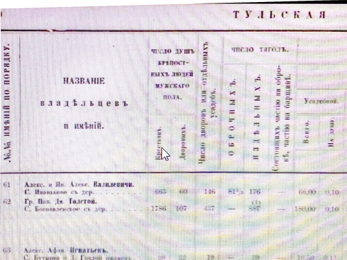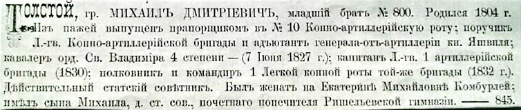 Он владелец села Хитрово и многочисленных деревень в Тульской губернии и селом Дединово в Рязанской губернии. В завещании фигурировала цифра до 11000 душ крепостных, количество земли около 18000 десятин, количество дворов 1561. Годовой доход Измайлова примерно 330000 рублей в год. Если село Дединово славилось заливными лугами, с которых в Москву поставляли в год до 600000 пудов сена, то в селе Хитрово «дом господский деревянный и при нем сад иррегулярной, конский двор и конюшня каменные: конский завод, в нем лошади немецкия, дацкия, неополитанския и англицкия...». Всех лошадей было более 1000 голов. Был чистокровный жеребец по кличке Красик, который стоил 7000 рублей (это при том, что простая лошадь стоила примерно 150 рублей). При господской усадьбе находилось до 500 голов очень хорошего рогатога скота холмогорской и английской пород. В овчарном помещении было до 5000 овец, в том числе 300 баранов чистой породы. На псарне находилось 673 собак разных пород. В 1827 году господский дом Измайлова обслуживало дворня из 271 мужчин и 231 женщин. И вот все это богатство, по решению суда, с 1836 года стало принадлежать графу Толстому. Александр Дмитриевич был «просвещенным, благородным и истинно добрым человеком. Он не отягощал крепостных своим присутствием, проживая постоянно в Москве». Граф А.Д.Толстой скончался внезапно в августе 1856 года, без прямых наследников, то есть без детей. После него не осталось никаких распоряжений относительно наследования имениями. Родные братья покойного графа Михаил и Павел на основании общих законов о наследстве, предьявили права свои и вступили во владения. Мои замечания: 1. Измайлов, ему 70 лет, Александру 40 лет. 2. Главная ценность села Дединово, не имеющего большого количества пахотной земли были богатые заливные луга, на которые Измайлов наложил властную руку, сдавая их в аренду и получая большие барыши. Дединовцы почти не занимались земледелием и по минимуму скотоводством. Вывод. Увеличение помещечьей пашни можно не только за счет расчистки кустарников, но и за счет Осушения болот. Не это ли послужило поводом организовать латышскую колонию (см. Павел Д. Толстой) 3. 1812г.- на ополчение Измайлов потратил 1000000 руб. - на сумму, равную доходам от всех владений за три года. На эти деньги можно было в те времена купить без малого 7000 лошадей. 4. Конюшня из кирпича, а господский дом из дерева - еще не пришла мода на каменные дома. Константин Дмитриевич Толстой (1806-1837). Служил в Ахтырском гусарском полку в чине корнета. В 1829 году был переведен в лейб-гвардии Гусарский полк. В 1833 его произвели в капитаны, в следующем году он вышел в отставку майором. В феврале 1837 года при Богоявленской церкви (село Хитрово) был похоронен в имении брата Александра. Его надгробие сохранилось до наших дней. Михаил Дмитриевич Толстой (1804-1891)
