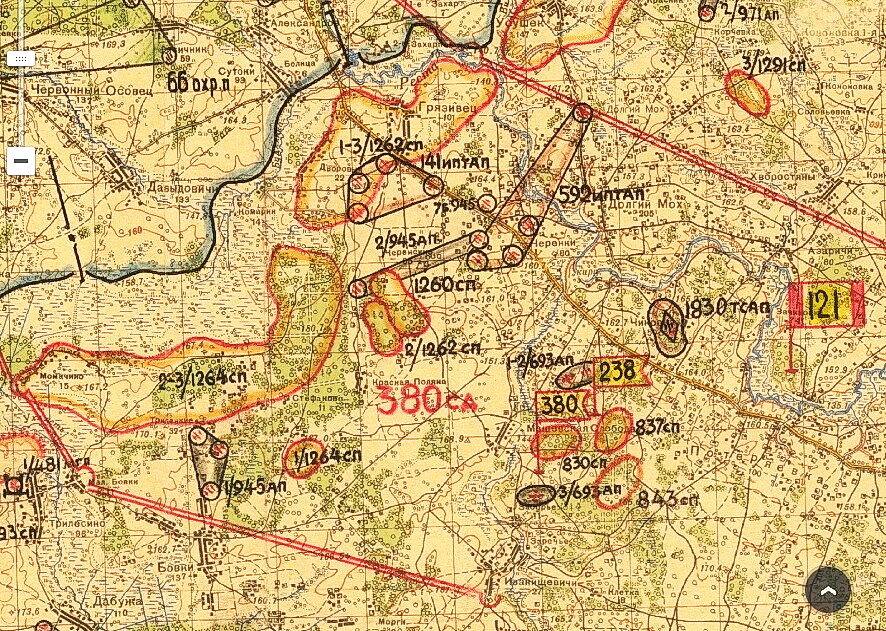С наблюдательного пункта хутора Комарин весь день ведется наблюдение за противником в секторе предстоящих действий 2 с.б. 1260с.п. высоты 164.3 на большаке Давыдовичи - Судоки. Приданная артиллерия и минометы днем закончили пристрелку. Подвезен строительный материал для переправы через реку Будлянка. В Ночь на 22.06. второй батальон занял исходное положение для наступления. В 3-30 стрелковые роты форсировали реку Будлянка и организованно, цепью (как на полковом учении) двинулись вперед и через 7 минут овладели первой линией траншей. После переноса арт.минометного огня по второй линии и в глубину по обнаруженным батареям противника пехота, преодолевая огневое сопротивление со второй линии траншейи, особенно с флангов, через 15-20 минут овладела второй линией, встретив ожесточенное сопротивление с третьей линии траншей. Попытки овладеть 3 линией успеха не имели - были отражены организационным огнем противника всех видов. В 5-00 дан сигнал отход, который равновременно был доведен до бойцов. Отход произведен не организованно, под прикрытием огня станковых пулеметов, минометов и артиллерии. В течение всего дня 22.06. производился сбор отставших, эвакуация раненых и техники. Потери: ранено - 82, убито - 44, пропали без вести - 18. Показав фашистам серьезные намерения на наступление 380 с.д. с этих позиций, командующий 50 Армии выводит дивизию в свой резерв, а в дальнейшем возложит на неё вспомогательное значение в предстоящем наступлении, т.е. 380-ой с.д. будет нанесен вспомогательный удар армии, форсирование реки Реста. Но уже в совершенно другой местности, где немецкие войска не тревожили , не давали никакого повода для наступления. Но будет это 26 июня - д.Островы, а сейчас, в ночь на 23.06. 380 с.д. сдала свои участки обороны частям 110 и 324 с.д. Здесь расположились отдельные наблюдательские посты и мелкие группы пехоты с кочующими станковыми ручными пулеметами, создающие видимость организационной системы огня с самым минимумом артиллерии и минометами.