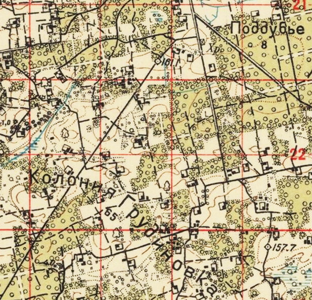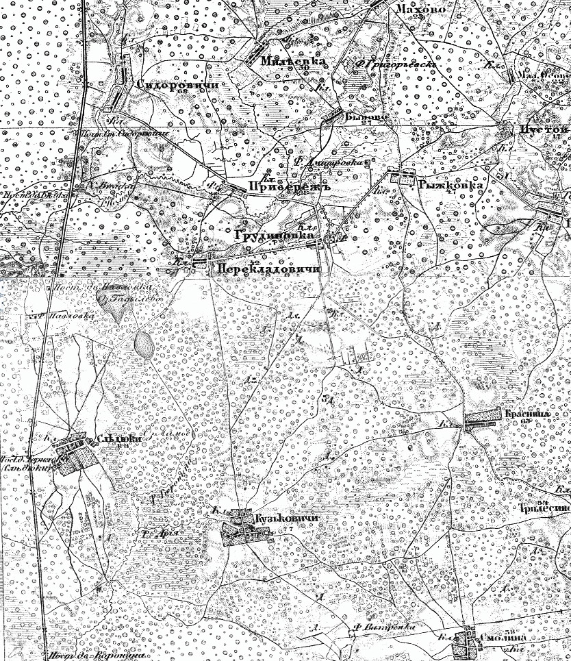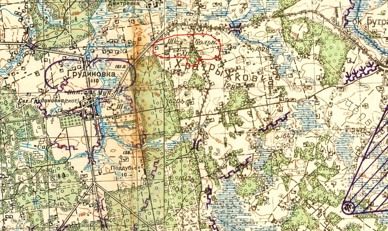 Фольварк Грудиновка - это усадьба графа с прислугой, которая в 1910 году составляла 30 человек. Церковный погост: 4 здания и 13 человек. И самое главное: население Грудиновки в 1857 году составляет 52 человека. В селе Грудиновка не было ни одной избы крестьянина, которые жили в деревнях вокруг села (Рыжковка, Перекладовичи, Грудиновская колония) (прим. администрации сайта: здесь В.Н.Грибовский под «селом» видимо подразумевает фольварк). 1903 год. Грудиновская волость. Начало постройки деревни Грудиновки (Грудиновские хутора) - на полпути между Грудиновкой и Рыжковкой и влево на Прибережье. Это здесь построено волостное управление, школа, магазин. Здесь и постройки домов крестьян. На предвоенных картах надпись - Грудиновка, а фольварк Грудиновка - свх. Грудиновка (скот) (прим. администрации: здесь В.Н.Грибовский видимо имеет ввиду то, что имущество старого поместья было изъято в пользу государства (национализировано), а на его базе был организован совхоз). Это в Грудиновке были ожесточенные бои с немецкими танками, прорвавшиеся с Рыжковки. Это здесь в 1942 немцы спалили большинство домов. Это отсюда после войны перевезли оставшиеся дома в свх (совхоз) Грудиновка. 1948 год. В Грудиновскую МТС (машино-тракторная станция) назначают директором Лепешева Клима Алексеевича. Нужны кадры. Он, не долго думая, с малой Родины (где родился) привозит машину специалистов из Хачинки. Что характерно, все они заселились в центре деревни - два брата Лепешевы, Шабловские, Грибовские, Исаковы, Лисиченковы, Крывулькины и т. д. Была еще Грудиновка 2 (после войны - Латколония). Поселок Поддубье (Крупское). Граф Д.А.Толстой, предводитель дворянства Могилевской губернии в 1805-1808 и хозяин «превосходнейшего конского завода». Рассматривая карту Шуберта отчетливо видно, что одной из первых дорог была дорога в Поддубье. Все это связано с истоком реки Полна. Имея заливные луга, а самое главное - воду, граф развил помимо коневодства и хозяйство крупного и мелкого рогатого скота, построив фермы на территории хутора, где и проживали скотники. Но наступил 1812 год. Война. Скот угнан, жилье спалено. Имение в упадке. Необходимость развития хутора отпала. В списке населенных мест (Пожаров) за 1910 Поддубье не упоминается. На картах впервые появился в 1926 году в количестве 8 дворов. А Крупское - это была бригада имени Н.Крупской, работники которой проживали в хуторе.