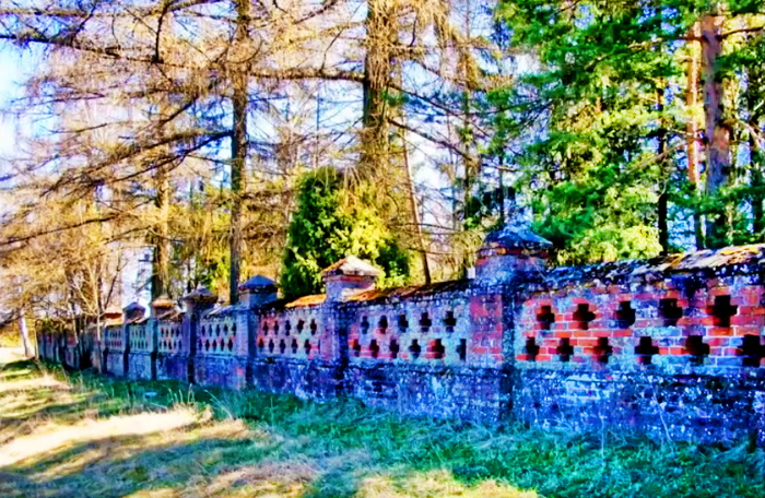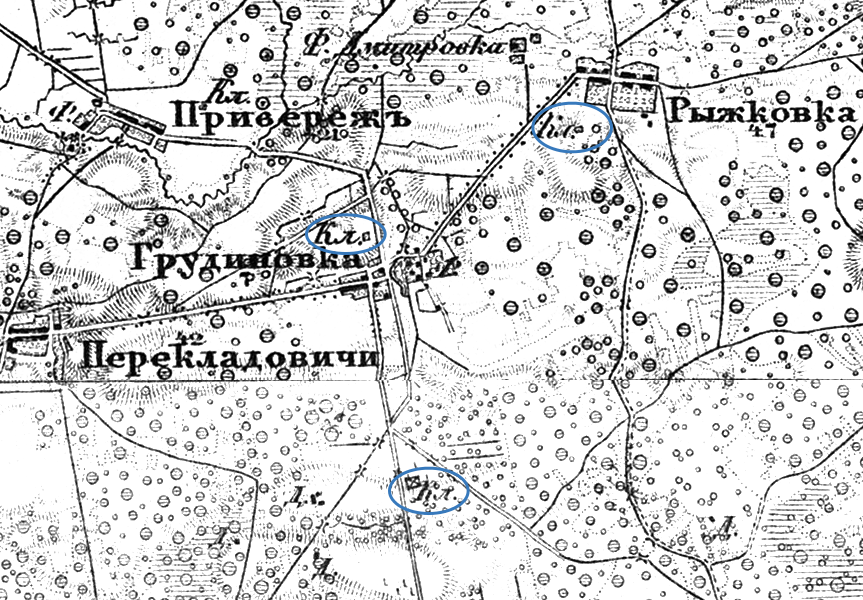 Я смотрю на этот снимок грудиновского кладбища. Сразу в глаза бросается то, что не каждое кладбище может гордиться редкой породой деревьев - лиственницами. Но не это главное. Главное - это фигурное каменное ограждение. И кроме этого кладбища, с таким рисунком (возможно выложенные в одно время под руководством графини Толстой), были еще два. Наша больница находилась в деревне Рыжковка. Не доходя до нее, по дороге, по правую сторону и располагалось рыжковское кладбище. Но я хотел бы обратить внимание на третье кладбище. Оно распологалось по дороге на Латколонию, недалеко от развилки дорог на Кузьковичи и Красницу, в лесу. И если бы не эта характерная ограда, никогда бы не подумал, что это кладбище. Само кладбище представляет исторический интерес тем, что оно обозначено на карте Шуберта 1869 года, подтверждая предположение, что первые латыши появились после 1861 года - после отмены крепостного права.