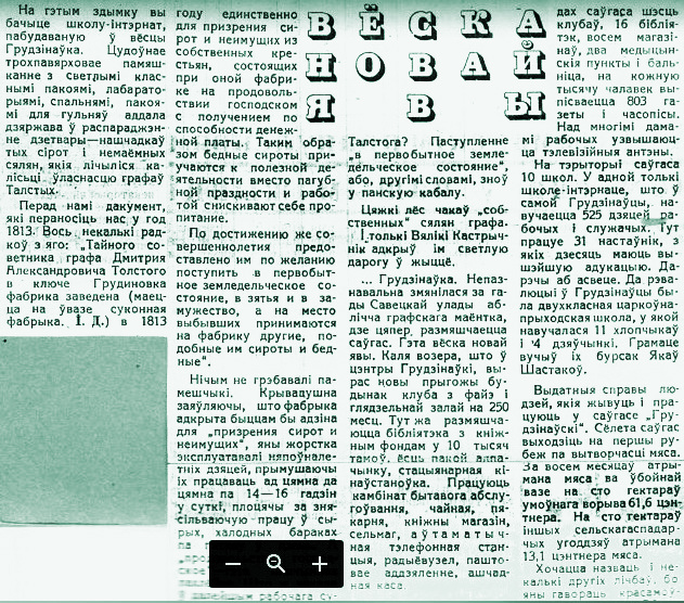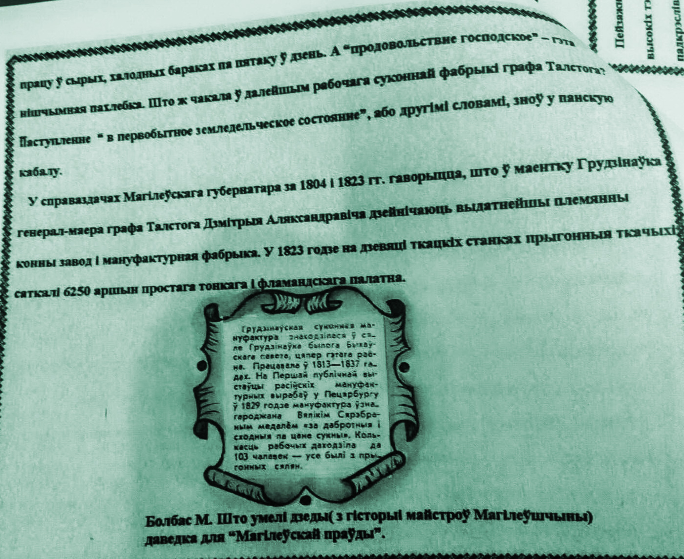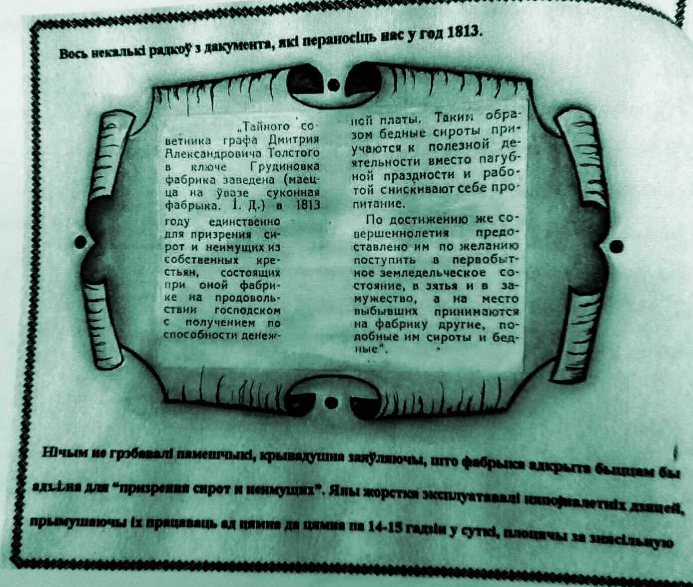Суконная мануфактура Перечитывая сотни исторических материалов, нигде на глаза не попадала эта тема. Так откуда в истории музея-библиотеки под редакцией бывшего библиотекаря Г.И.Поливиковой появился этот материал: «1813-1837 - в деревне Грудиновка была суконная мануфактура. В 1823 году - на девяти ткацких станках крепостных мастеров грудиновской мануфактуры ткачи ткали 6250 аршин из простого тонкого фламандского сукна (аршин - 0,7 м). В 1829 году количество рабочих достигло 103 человек - все были крестьянами. Ей вторит Г.П.Пашков (Грудиновка. Города и села Беларуси. Энциклопедия 2008): «В 1809-1837 действовала палатняная мануфактура. 1830 г. - 86 рабочих». И, наконец, пункт 35 из книги С.Ф.Жижияна «101 занимательный факт из истории Быховщины»: «На первой российской промышленной выставке, которая проводилась в 1829 в Москве, сукно фабрики графа Д.А.Толстого, которая находилась в селе Грудиновка Быховского уезда, было удостоено большой серебряной медалью» (С.Жижиян. Стежками минулага. Маяк Приднепровья. 2010 год). Ссылок на исторические документы авторы не приводят.